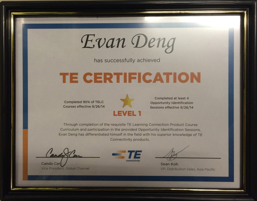 在TELC项目中,我司的业务部邓经理是亚太区第一个获得TE的认证, 希望以后我司会以更专业的技术知识服务于客户。