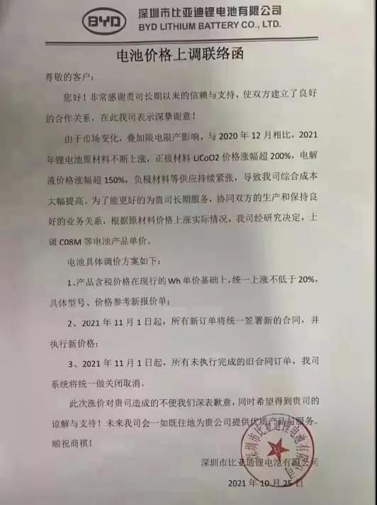 深圳市比亚迪锂电池有限公司电池价格上调联络函尊敬的客户:您好!非常感谢贵司长期以来的信赖与支持,使双方建立了良好的合作关系,在此我司表示深挚谢意!由于市场变化,叠加限电限产影响,与2020年12月相比,2021年锂电池原材料不断上涨,正极材料LiCoO2价格涨幅超200%,电解液价格涨幅超150%,负极材料等供应持续紧张,导致我司综合成本大幅提高。为了能更好的为贵司长期服务,协同双方的生产和保持良好的业务关系,根据原材料价格上涨实际情况,我司经研究决定,上调C08M等电池产品单价。电池具体调价方案如下:1、产品含税价格在现行的Wh单价基础上,统一上涨不低于20%,具体型号、价格参考新报价单:2、2021年11月1日起,所有新订单将统一签署新的合同,并执行新价格;3、2021年11月1日起,所有未执行完成的旧合同订单,我司系统将统一做关闭取消。此次涨价对贵司造成的不便xiongmao熊猫体育深表歉意,同时希望得到贵司的谅解与支持!未来我司会一如既往地为贵公司提供优质产品与服务。顺祝商祺!深圳市比亚迪锂电池有限公司2021年10月25日